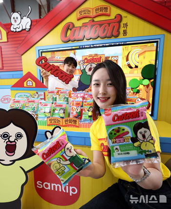 19日午前、ソウル市江南区の「パンパンとオクジの萬物相」ポップアップストアで、「SPC三立×パンパンくんの日常」の新製品8種類をPRするコンパニオンの様子。