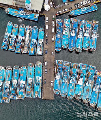 【NEWSIS】台風9号「JONGDARI(ジョンダリ、ひばりの意)」が北上中の20日午前、済州特別自治道西帰浦市内の西帰浦港で、台風に備えて避難している漁船の様子。 台風9号は小型の台風で、現在は..