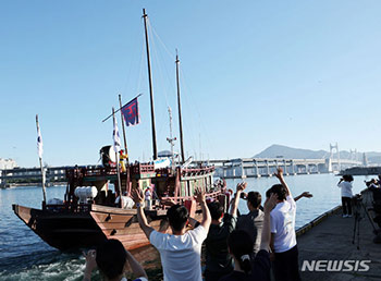 【NEWSIS】韓国国立海洋遺産研究所が2018年に復元した朝鮮通信使の船が31日午前、釜山市南区の竜湖星光公園から日本に向かって出発した。同日出発した朝鮮通信使船は8月29日まで約1カ月間をかけて..