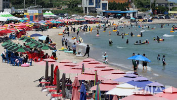 【NEWSIS】連日猛暑が続いている1日、慶尚北道浦項市の九竜浦海水浴場では、訪れた避暑客が水遊びをして涼を取っていた。