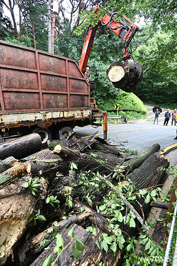 【NEWSIS】8日、京畿道水原市八達区・八達山路の旧京畿道庁付近の道路に、梅雨の降雨のせいで木が倒れ、関係者らが安全措置を取っているところ。