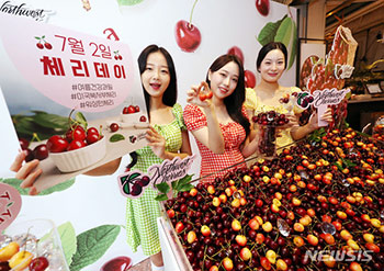 2日午前、ソウル市瑞草区のGTタワーで行われた米国北西部チェリー協会主催の「チェリーデイ」イベントで、コンパニオンらがチェリーをPRした。チェリーデイは、韓国語で7月2日を「チリ」と呼び、チェリーと..
