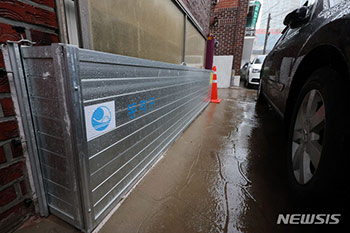 ソウル地域に豪雨注意報が発令された2日午後、ソウル市銅雀区新大方洞の低地帯住宅に、水害予防用の浸水防止板が設置されている様子。