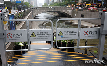 【NEWSIS】梅雨に伴って韓国各地に雨が降った2日、ソウル市中区の清渓川散策路は、浸水の危険があるため立ち入り禁止になっていた。