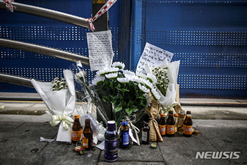 【NEWSIS】ソウル市中区の市庁駅交差点付近で1日に発生した逆走車の突進による交通事故。写真は3日、事故現場には犠牲者のために追悼の菊の花やメッセージなどが供えられていた。