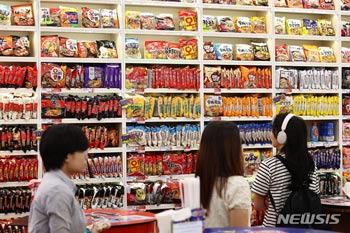 韓国コンビニ大手「CU」の弘大サンサンマダン店(ソウル市麻浦区)で3日午前、ラーメンを選んでいる外国人の様子。ラーメンはKフードの中でも最多の輸出品目で、今年上半期の輸出額は前年より30%以上多い6億..