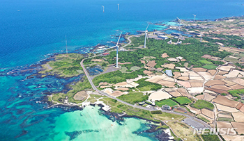 晴天となった28日午後、済州市旧左邑上空から望む済州のパッタム(石を積んで作った畑の境界)の様子は、青い海岸線と調和して絵画のような美しい光景を作り上げていた。