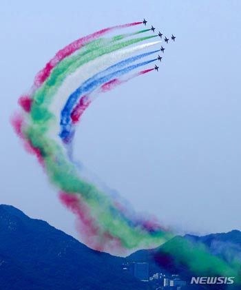 韓国空軍の特殊飛行チーム「ブラックイーグルス」が29日午前、ソウル都心上空で、アラブ首長国連邦(UAE)ムハンマド・ビン・ザイド・アル・ナヒヤーン大統領(アブダビ首長)訪韓歓迎飛行を行っている。
