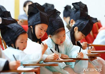 ソウル市竜山区の国立ハングル博物館で15日、第627周年世宗大王生誕日記念行事として「世宗、人材を選ぶ」が開かれ、参加した子どもたちが「科挙」の試験を体験している様子。