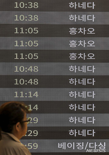 【NEWSIS】16日、ソウル市江西区の金浦国際空港国際線到着場に表示されている航空便到着情報の様子。 日本を訪れた外国人の数が、3月に続いて2カ月連続で300万人を上回った。韓国人訪問客が国籍別順..