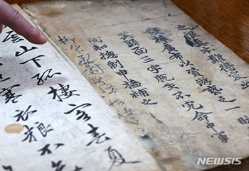 9日午後、ソウル市東大門区の世宗大王記念館で開かれた「世宗大王御筆探し学術大会」で、関係者が世宗の直筆、すなわち「御筆」と考えられる「雪菴法帖 兵衛森跋文」初刊本の原本を紹介しているところ。