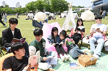 9日、成均館大学自然科学キャンパス(京畿道水原市)の芝生広場では、「ブックピクニック」イベントに参加した学生らが対話を交わしつつ本を読んでいた。