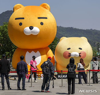 2日、ソウル・フェスタ2024の一環でソウル市鍾路区の光化門広場に設けられたカカオフレンズ・フォトゾーンで、市民らが巨大なライアン、チュンシクを眺めていた。