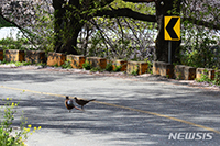 慶尚南道南海郡古県面では1日午前、満開の桜の下、キジのつがいが道路を歩いていた。