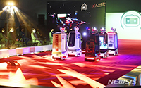 1日、京畿道水原市霊通区の水原コンベンションセンターで開かれた「2021コリア・ロボショー」で、消毒、応急、案内、広告、保安、放送など自律走行技術を応用してさまざまな分野に適応できる各種サービスロボッ..