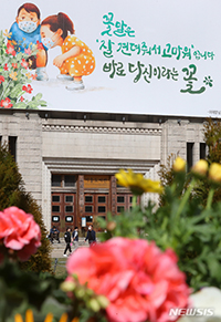 ソウル図書館(ソウル市中区)外壁の「ソウル・夢を刻むパネル」に16日午後、今春の公募当選作であるイ・ジェヨンさんの「花言葉は『よく耐えてくれてありがとう』です。そう、あなたという花」という言葉が掲げら..