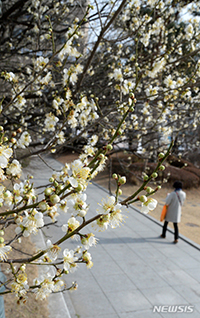 温かい天気が続いている23日、全羅北道全州市の全州市庁前「老松広場」では、近付きつつある春を迎えるかのようにウメの花が満開になっていた。