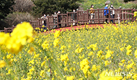 きれいな晴天となった20日午後、済州島西帰浦市穡達洞のオンドンムル渓谷では、訪れた観光客が大きく咲いた菜の花を眺めて楽しい一時を過ごしていた。韓国気象庁によると同日、済州島城山邑で昼間の基本が18.9..