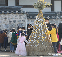 民俗最大の名節・旧正月を迎えた12日午後、ソウル市中区の南山韓屋(韓国の伝統家屋)村で開催された「明朗小説」イベントで、市民たちが願いを書いた紙を藁や薪で作ったやぐらに取り付けていた。