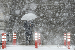 ソウル地域に大雪注意報が発表された28日午前、ソウル市中区の通りでは、人々が雪の中急ぎ足で歩いていた。