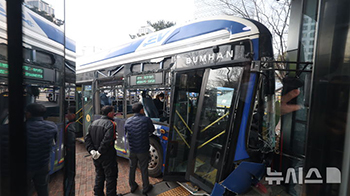 【NEWSIS】16日午後、ソウル市西大門区の西大門駅交差点で、バスが歩道へ突進してビルに突っ込む事故が発生し、警察と消防当局が現場で対応に当たった。