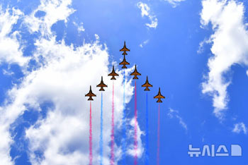 韓国空軍の特殊飛行チーム「ブラックイーグルス」が23日午前、慶尚南道の泗川飛行場で行われた「2024泗川エアショー」の最終リハーサルで展示飛行を実施している様子。2024泗川エアショーは24日から27..