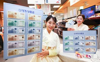 【NEWSIS】大手スーパー「Eマート」が、旧正月(今年は2月17日)を前に新世界商品券の販売を始めた。写真は14日午前、ソウル市竜山区の「Eマート竜山店」で、新世界商品券を持ってポーズを取ってみせる..