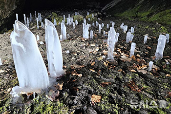 【NEWSIS】このところマイナス20度まで気温が下がる強い寒さが続いたことで、忠清北道堤川市徳山面の月嶽山宝徳窟では15日、「氷筍」ができていた。氷筍は、洞窟の天井から落ちる水が凍り付いてできる。