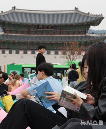 【NEWSIS】13日、ソウル市鍾路区の光化門広場にあるソウル野外図書館「本の広場」で、韓江(ハン・ガン)氏のノーベル文学賞受賞を祝うため、特別展示が行われた。写真は韓江氏の本を読む人々。 今回の特..
