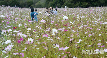 【NEWSIS】秋晴れが続いた13日、全北特別自治道任実郡のコスモス畑を訪れ、散歩したり記念撮影したりする人々。