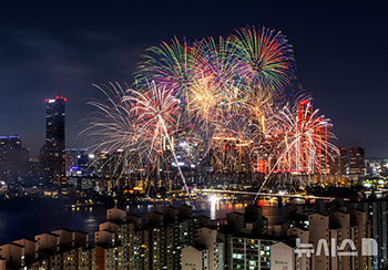 5日の夜、ソウルの汝矣島漢江公園一帯で「2024ソウル世界花火祭り」が行なわれている様子。