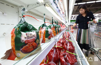 26日、ソウル市内のある大手スーパーのキムチ売場で、店を訪れた人が白菜キムチを見て回っている様子。 大象宗家キムチやCJ第一製糖bibigoキムチなどキムチ業界は、猛暑による収穫量減少でハクサイの価..
