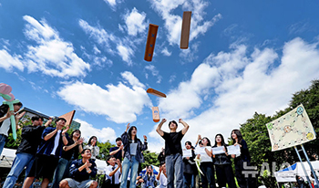 【NEWSIS】23日、大邱市達西区の啓明大学城西キャンパスで開かれた創立125周年記念学生文化週間の行事で、教育学科の学生たちがユンノリ(すごろく風の韓国伝統の遊戯)をしている様子。