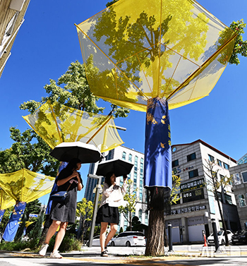 【NEWSIS】24日、京畿道水原市八達区の孝園路の街路樹に、銀杏の実の収集網が設置されている様子。 水原市は、秋に地面に落ちて悪臭発生の原因となり、美観も損なう銀杏の実に関する被害を防ぐため、市内..