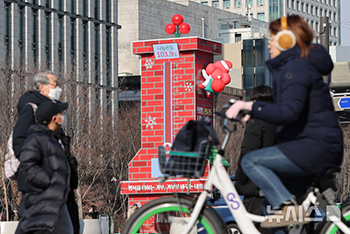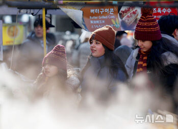【NEWSIS】氷点下の寒さが続く11日、ソウル市中区のショッピング街・明洞を訪れた旅行客たち。厚手の服や帽子でしっかり防寒対策をしていた。