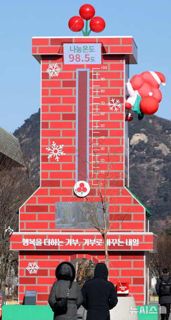 【NEWSIS】11日午前、ソウル市鍾路区の光化門広場に設置された愛の温度塔は「助け合い温度98.5℃」と表示されていた。愛の温度塔は募金目標額を「助け合い温度100℃」としている。