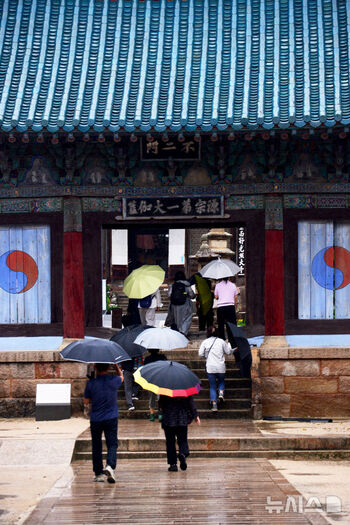 【NEWSIS】秋を催促する雨天となった21日午前、慶尚南道梁山市の通度寺では、訪れた人々が傘を差して境内を歩いていた。