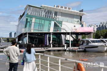 【NEWSIS】22日午前、ソウル市瑞草区の蚕院漢江公園にある水上ビルが傾き、立ち入り禁止となった。