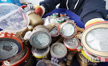 【NEWSIS】ソウルに寒波注意報が発令された8日、ソウル市江北区のソウル北部水道事業所では、凍結により破損した水道計を職員が整理していた。