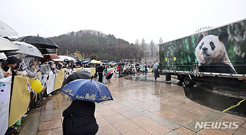京畿道竜仁市のエバーランドで3日午前、中国に向かうパンダ「プーバオ(福宝)」を乗せた特殊車両を市民たちが見送った。