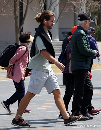 昼間の最高気温が24度まで上昇し、今春最も温かい天気となった2日、半ズボンに半袖という服装でソウル大公園(京畿道果川市)を訪れた外国人観光客の様子。