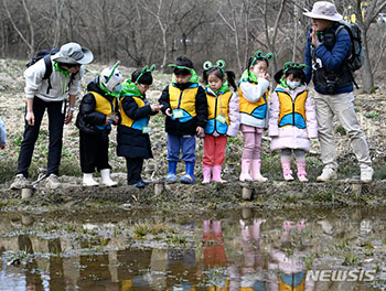 光州市北区の「ピョンドゥメ湿地」で20日、「ラムサール湿地登録祈願踏査隊」に参加した子どもたちが、オタマジャクシやカエルを探しながら楽しいひとときを過ごしている様子。光州市北区は、ピョンドゥメ湿地が韓..