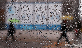 春を催促する雨が降った29日、釜山市西区の街角で、傘を差して行き交う市民の様子。