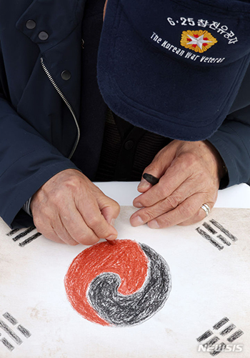29日午後、ソウル市恩平区の名誉道路「権愛羅路」で開かれた津寬寺太極旗描きイベントで太極旗を描いている6・25参戦有功者のおじいさん。
