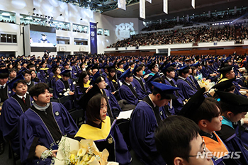 26日午後、ソウル市冠岳区のソウル大学で開かれた第78回学位授与式で、卒業生らが柳弘林(ユ・ホンリム)総長の式辞を聞いている様子。