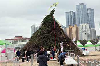 正月テボルム(陰暦小正月。今年は2月24日)をあすに控えた23日、釜山市海雲台区の海雲台海水浴場を訪れた市民が、浜辺に造成された大きなタルチプ(月の家。小正月に合わせて焼く造形物)に願い事を書いた祈願..