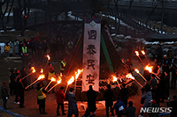 小正月(旧暦1月15日)を翌日に控えた23日、ソウル市瑞草区の良才川で行われた瑞草区主催の小正月祝祭で、区民たちが薪の山を眺めながら願い事をした。
