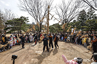正月テボルム(陰暦小正月)を迎えた24日、国立民俗博物館(ソウル市鍾路区)の梧村宅前で、豊作祈願の竿を立てる「ピョッカリッテ立て」が行われているところ。