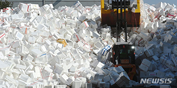 12日、京畿道竜仁市処仁区二東邑の公共リサイクルセンターには、旧正月(今年は2月10日)の連休中に各家庭から廃棄物として出た発泡スチロールの箱がぎっしりと積み上げられていた。