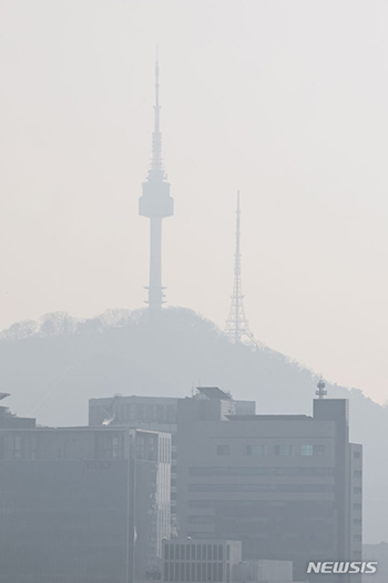 PM2.5注意報が発令された12日、ソウル市内から望む南山タワーは白くかすんで見えた。